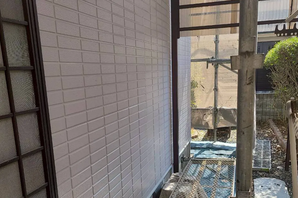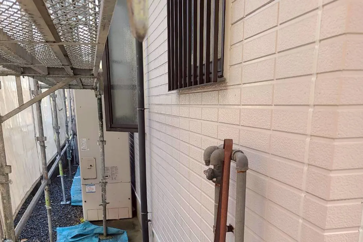 外壁の状態を確認すると、経年による汚れだけでなく、大津市特有の湿気の影響で壁にコケが付着していました。これを残したまま上から塗ってしまうと、数年で塗膜が剥がれる原因になります。そのため、業務用の高圧洗浄機を使用し、古い塗膜の粉(チョーキング)と一緒に根こそぎ洗い流しました。