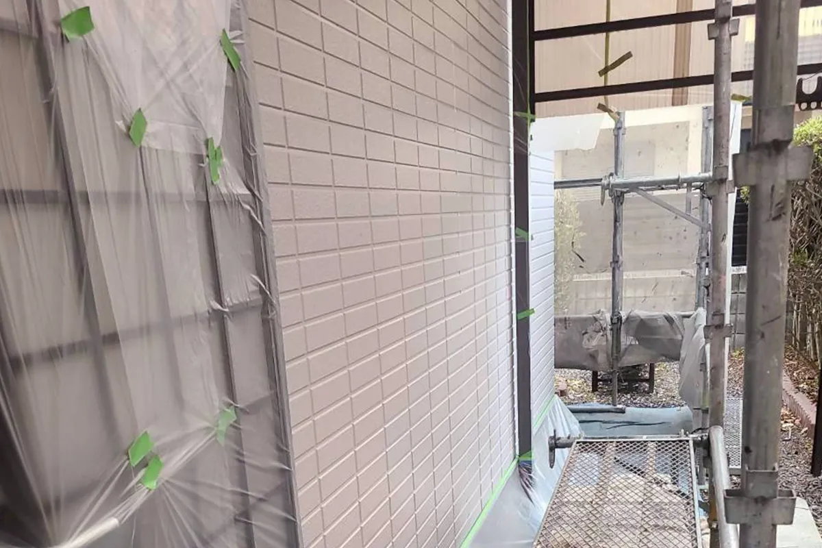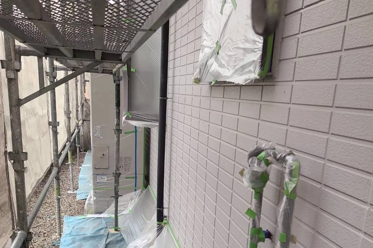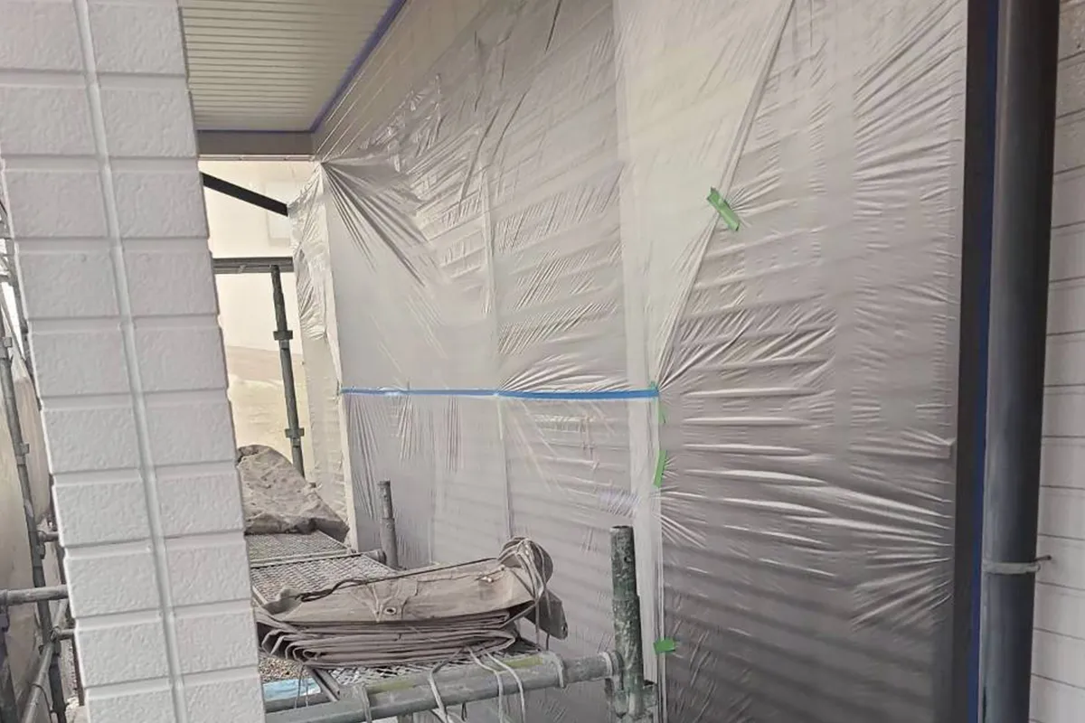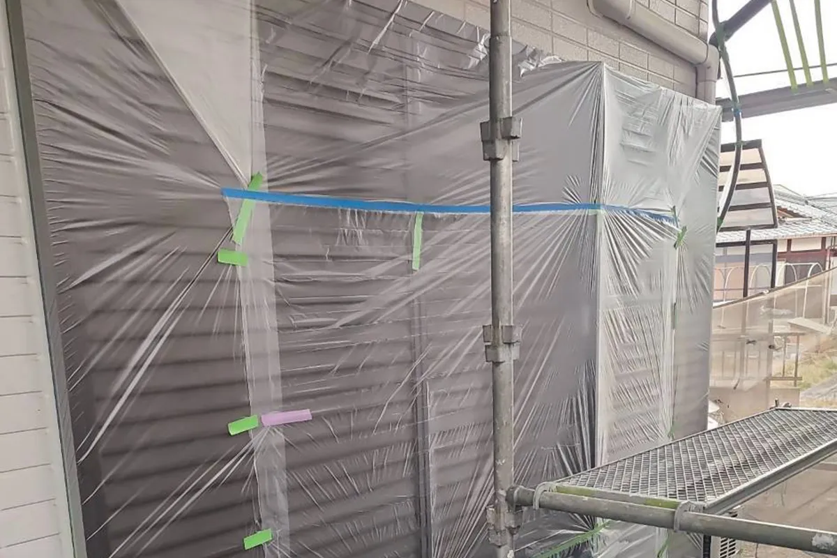 前回の洗浄に引き続き、大津市里の現場にて「養生(ようじょう)」作業を行いました。養生とは、塗装しない窓や床、玄関ドアなどをビニールやテープで保護する工程です。実はこの作業の丁寧さが、最終的な塗り替えの「ライン(縁)の美しさ」を左右する、職人の腕の見せ所でもあります。