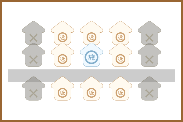 平地の住宅街の場合は、下図のように8軒程度への挨拶を行えば、十分な対応と言えるでしょう。