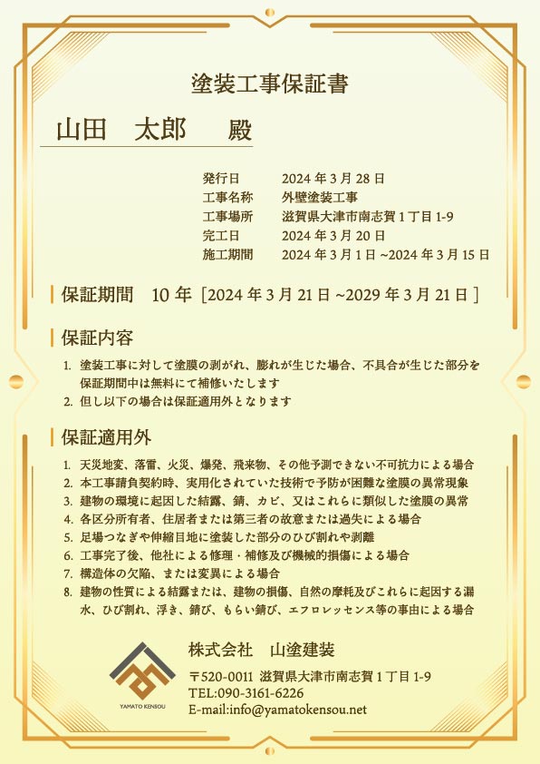 山塗建装では万が一の施工不良や欠陥があった場合にもご安心いただけるよう工事保証をご準備しております。